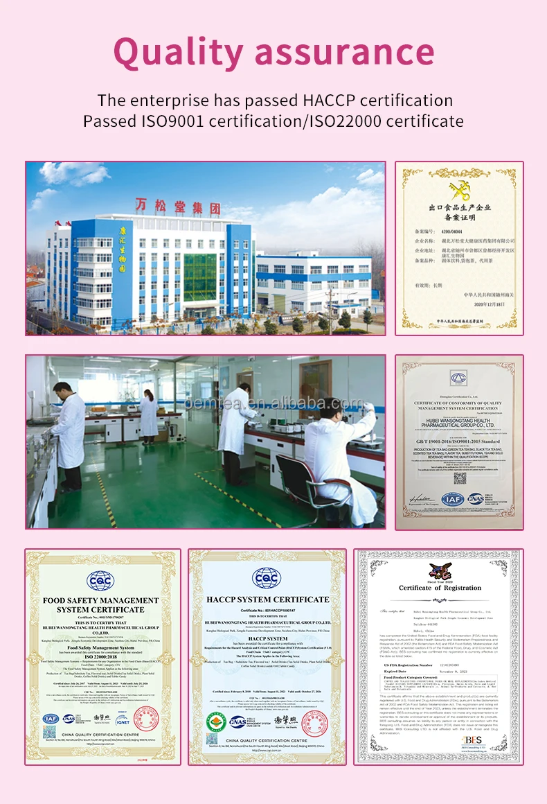 WUHAN WAN SONG TANG HEALTH INDUSTRY CO.,LTD is the headquarters of wansong tang group. The company is located in wuhan, hubei province,China.with good location.Besides, it also has tea planting, research and development, production, sales, export of foreign trade, OEM, shopping, joining chain, auxiliary meal powder and so on. The company has established a strategic cooperative relationship with more than ten famous institutions both at home and abroad to ensure the advancement of techniques and technology.Introduces domestic advanced tea bag, auxiliary meal powder production line, packaging workshop, FSSC22000, HACCP certification in the industry took the lead through the ISO9001 international quality system certification, QS food safety certification, auxiliary meal powder QS certification, GMP certification, to ensure the stability of product quality.After years of market sharpening and settling, we have established a good cooperative relationship with many domestic and foreign enterprises, and established the popularity and reputation of the brand.The company independently develops and produces a variety of products. And have national patent technology and rich channel operation experience.In addition, the company also has a number of tea brands such as Wansongtang, winstown, shennongzhai, zhenmei, huiton and yichu tang, etc.It has become the strategic partner and wealth promoter of many dealer friends with the obvious advantages of nationalization, special packaging, copywriting and pricing.The product network covers all the provinces and regions of China, and sells to more than 20 countries and regions in Europe, America, Middle East, Russia, Africa and southeast Asia. The company provides OEM leading tasks for high-end customers, such as tea, meal nutrition powder, etc., and has provided service for over 4000 well-known enterprises in China and abroad.The dosage forms are varied and varied.
