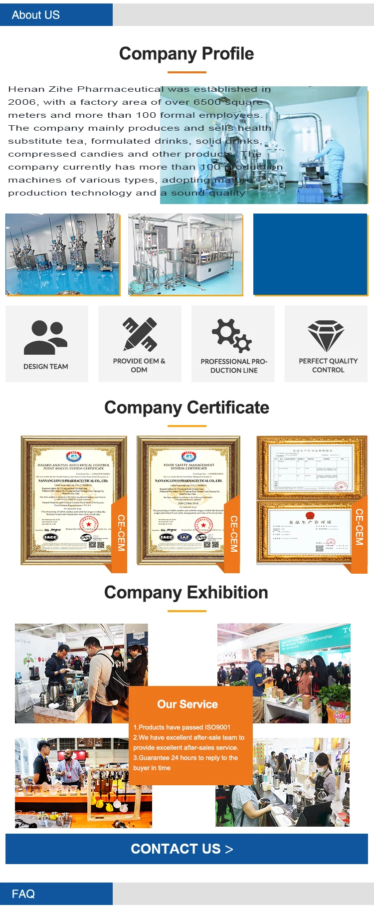 Q.What products do we have? A.We mainly produce and sell health substitute tea, blended drinks, solid drinks, compressed candies and other products. The company currently has more than 100 production machines of various types, using mature production technology and a sound quality management system. We can do our best to meet your local market needs.