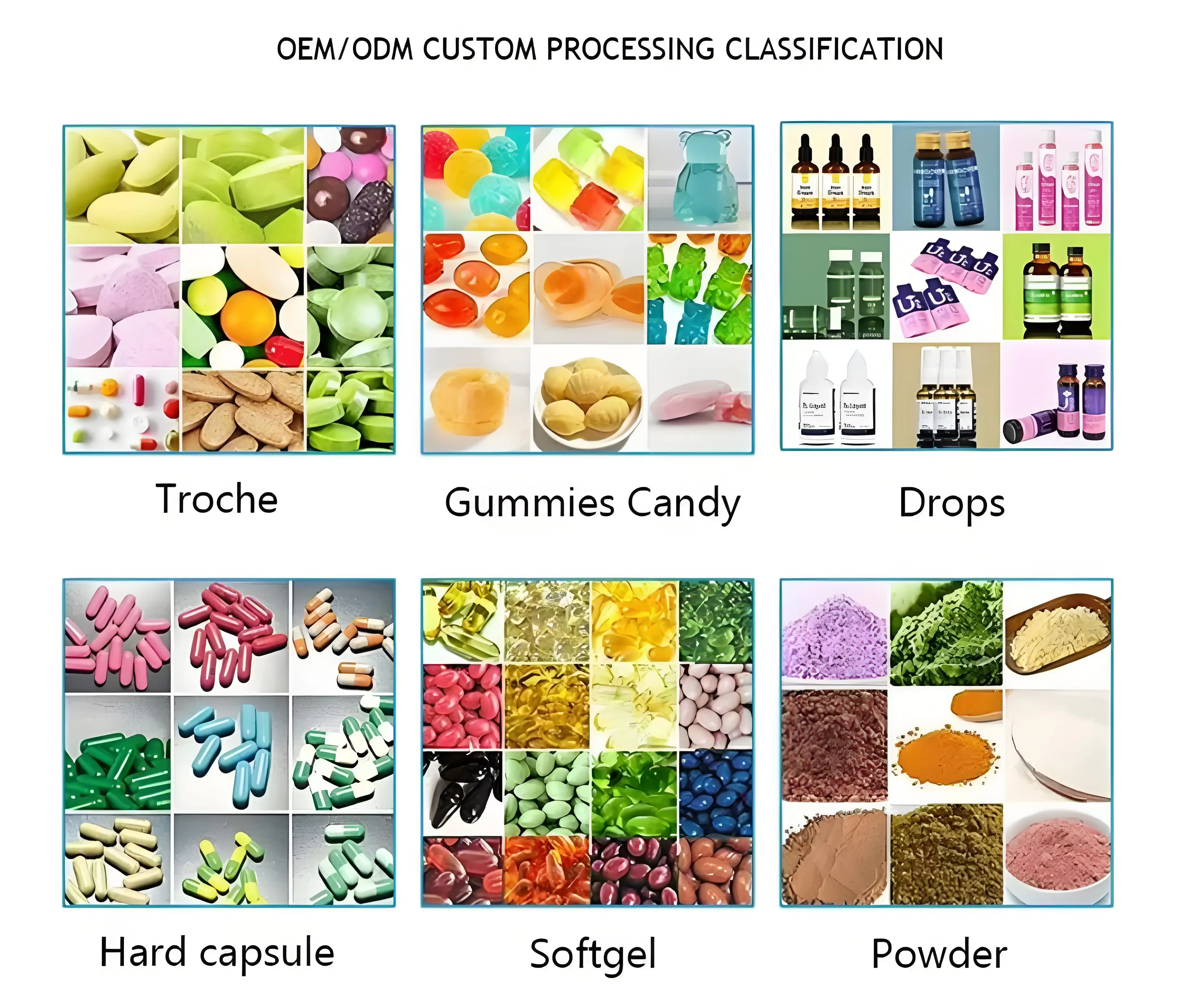 A: Pre mix powder, Capsules, Tablets, pills, Softgel,drops, Gummy.