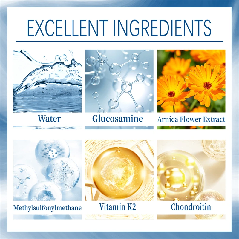 Ingredients | Water,glucosamine,arnica flower extract,methylsulfonylmethane,vitamin k2 | ||||||